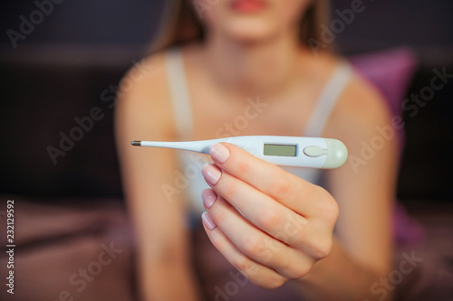Cut view of blonde woman sitting on bed and holding thermometer in hand. She shows it on camera. Young woman is serious and concentrated.