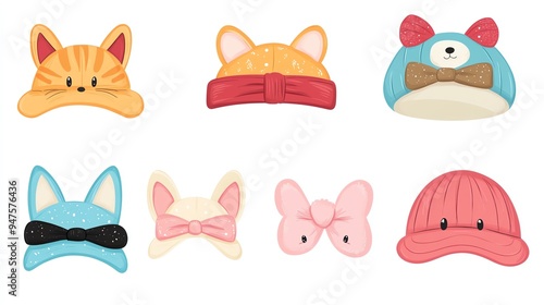 Cute accessories set clipart, adorable hats, with bows and animal ears, isolated on white background