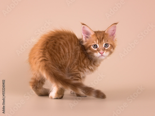 Cute adorable tabby ginger maine coon kitten on beige isolated background