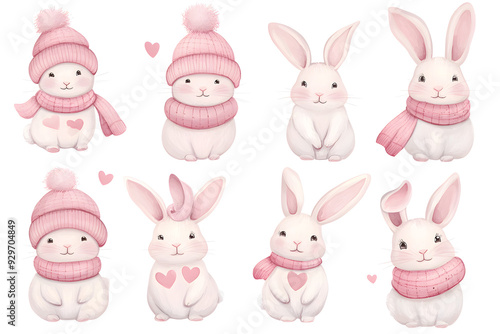 Cute adorable tiny bunny collection with warm hat and scarf isolated on a white background