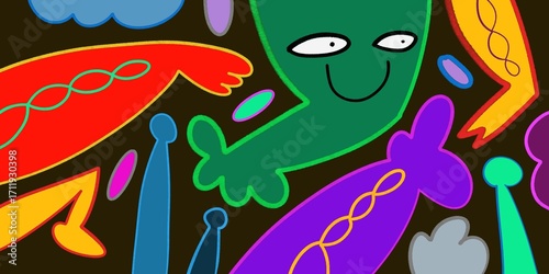 Cute and Funny cartoon colorful doodle and abstract animal, people, flower, and plant for kids and party