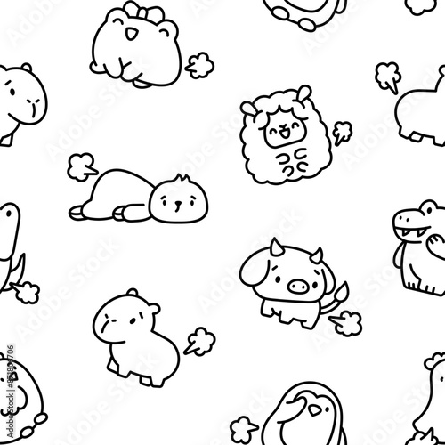 Cute and funny farting animals. Seamless pattern. Coloring Page. Cartoon characters. Hand drawn style. Vector drawing. Design ornaments.