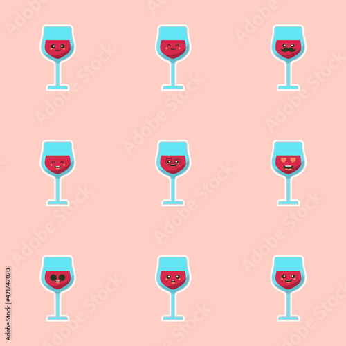 cute and kawaii glass of red wine, cartoon character design. Alcohol mascot. Transparent glass. Flat vector illustration isolated on color background