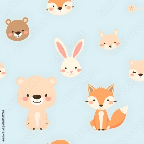 Cute animal characters (smiling bear, rabbit, fox) drawn in pastel tones on a sky blue background, repeated at 5cm intervals
