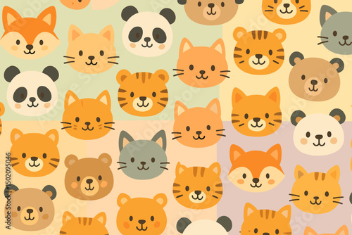Cute animal faces pattern featuring pandas, foxes, and tigers in soft pastel colors