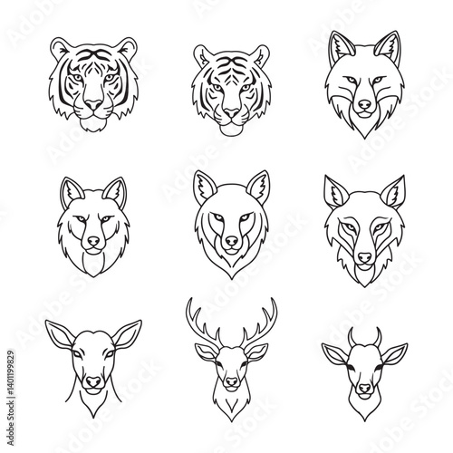 cute animal faces vector set outline design with cats dogs tiger lion wolf and deer illustrations