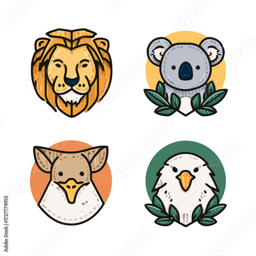 Cute animal illustration set featuring a lion, koala, platypus, and eagle