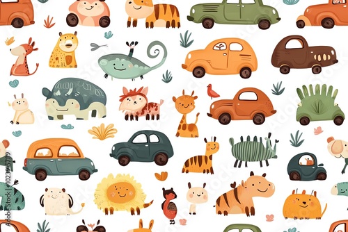 Cute animals and cars seamless pattern