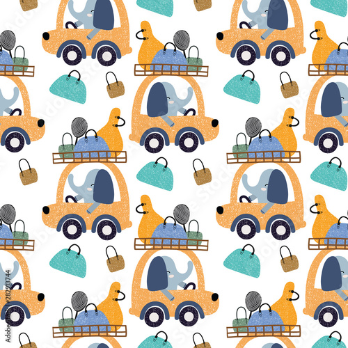 Cute animals driving a car with bags seamless pattern background. Design for fabric, wrapping, textile, wallpaper, apparel.