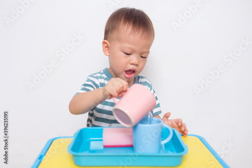 Cute Asian toddler boy having fun pouring water into cup, Wet Pouring Montessori Preschool Practical Life Activities, Fine Motor Skills, Kid Sense Child Development concept - Soft & Selective focus