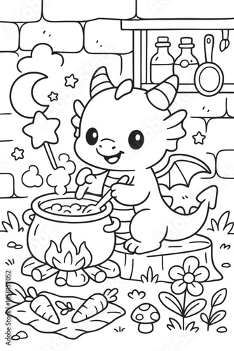 Cute baby dragon stirring potion in cauldron with magic wand illustration
