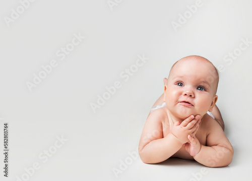 Cute baby empty copy space background. Caucasian infant advertisement space.Adorable child healthcare concept. Kid in diaper.