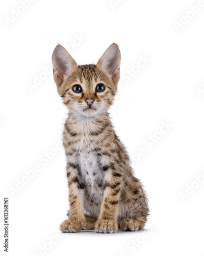 Cute baby Savannah cat kitten, sitting up facing front. Looking towards with kitten blue eyes. Isolated on a white background.