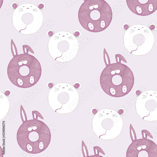Cute baby seamless pattern with pink donut rabbit and mouse