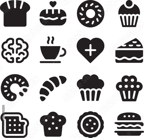 Cute Bakery and Cafe Icons Set – Cupcake, Coffee, Donut, Cake, Heart Symbols