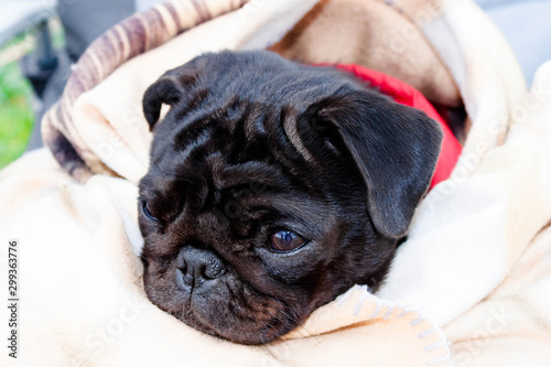 Cute beautiful black frozen pug wrapped in a warm blanket. Full-face close-up view.