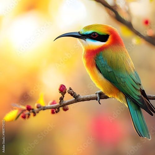 Cute bee-eater enjoying sunny day on tree branc image