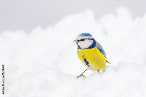 Cute bird and winter. White snow background. Bird: Eurasian Blue Tit.