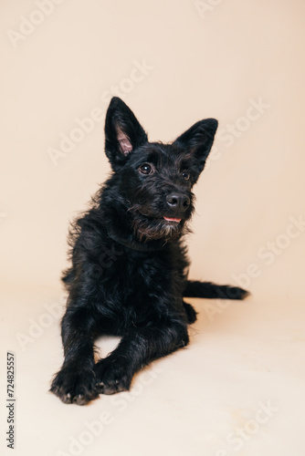 Cute black crossbreed dog having its adoption photos taken in a studio.