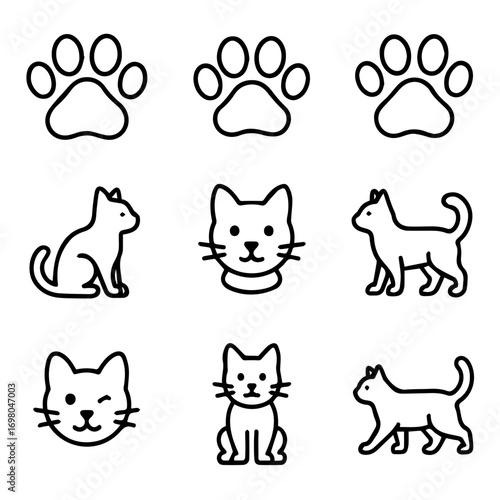 Cute Black Line Art Illustrations of Cats and Paw Prints.