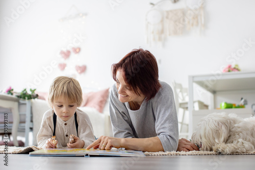Cute blond preschool child, blond boy with pet maltese dog, reading book at home with mother