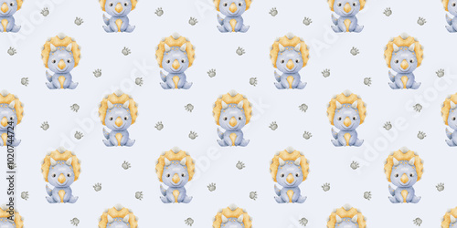 Cute blue dino, Dinosaurs and footprints. Print with triceratops. Watercolor seamless pattern for design kid's goods cards, postcards, fabric, scrapbooking, office supplies