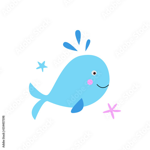 Cute blue whale on isolated white background. Vector illustration of kawaii little baby whale in flat cartoon style