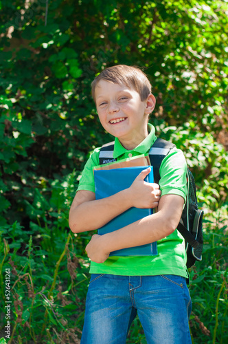 Cute boy in a green t-shirt with a school backpack and school books in the park. Back to school