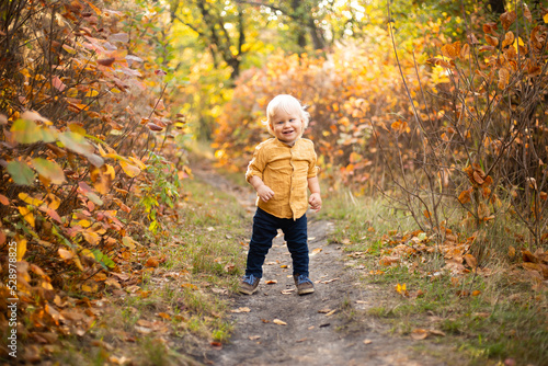 cute boy in autumn forest background with golden and red trees