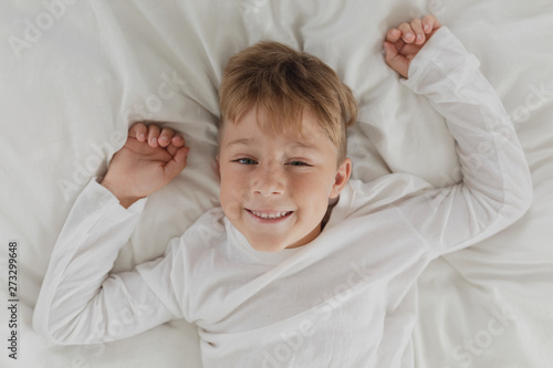 Cute boy looking at camera while lying on bed in bedroom at comfortable home