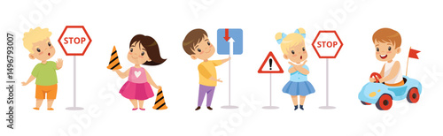 Cute Boys and Girls Learning Traffic Rules Vector Set