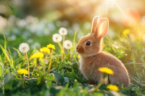 Cute brown rabbit in a green field of dandelions, looking at the camera on a sunny spring day. Easter themed background with open space. Easter bunny concept.