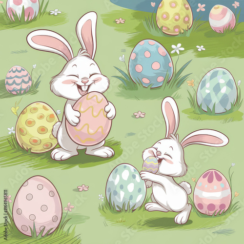 Cute bunnies with Easter eggs in a spring meadow for a spring time holiday easter illustration