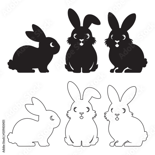 Cute Bunny Rabbit Silhouette and Outline Vector Icon Set