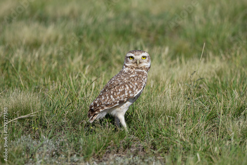 Cute Burrowing owl looking curious at camera. Green grass as background