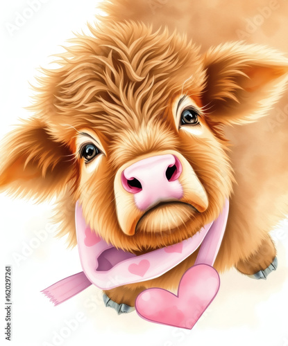Cute calf adorned with a pink scarf and heart, radiating joy in a vibrant artistic setting