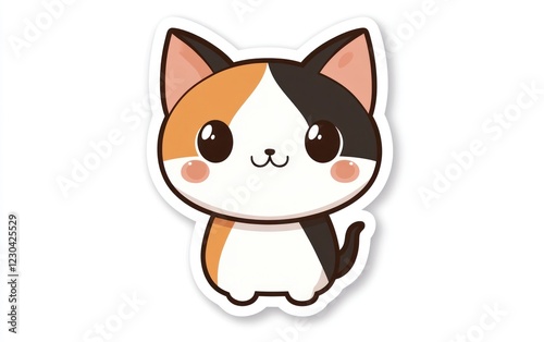 Cute calico kitten cartoon, white background, children's book illustration