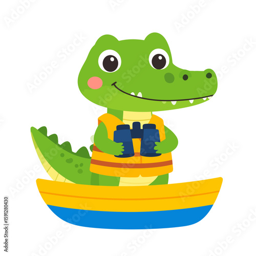Cute cartoon alligator explorer in a yellow boat, wearing a life vest and holding blue binoculars.