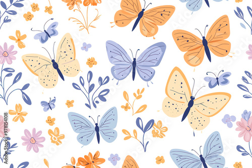 Cute cartoon and delicate butterflies with flowers. Seamless spring and summer pattern.