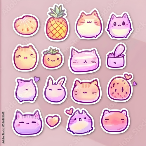Cute cartoon animal and food stickers, vibrant colors, digital art, for social media or merchandise