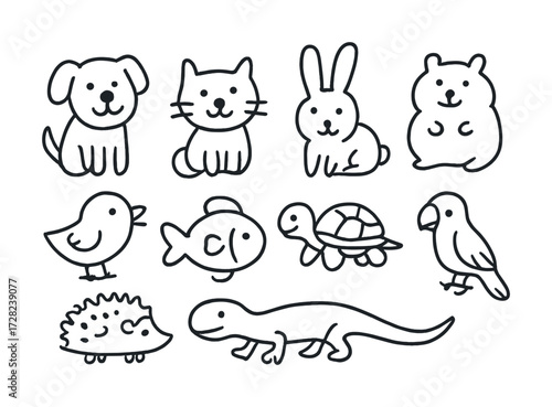 Cute cartoon animal doodles: dog, cat, rabbit, hamster, duck, fish, turtle, parrot, hedgehog, lizard