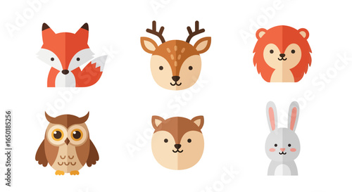 Cute Cartoon Animal Heads Collection - Fox, Deer, Lion, Owl, Raccoon, Rabbit.