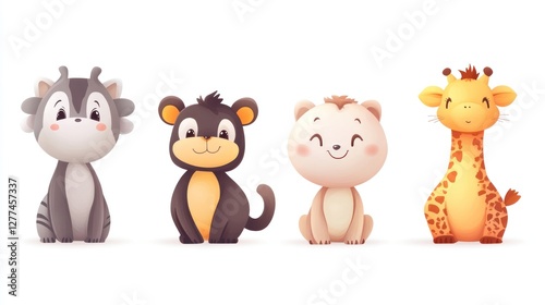 Cute cartoon animal illustrations, featuring a gray cat, brown bear, light beige lion, and a yellow giraffe, sitting in profile view, with soft, pastel colors and a cheerful expression..