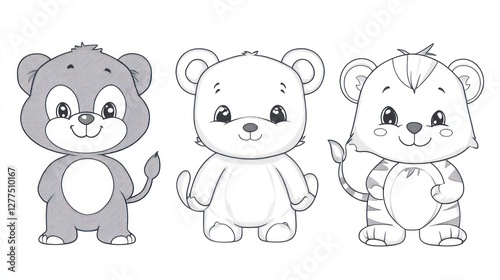 Cute cartoon animals, bear, tiger, and polar bear. Coloring page design with three adorable, stylized, outlined, and simple animals.