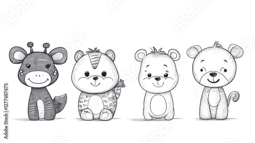 Cute cartoon animals sketch. Four adorable baby animals, giraffe, tiger, bear, and monkey, drawn in a childlike style.