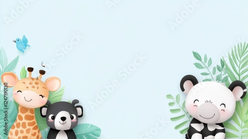 Cute Cartoon Animals with Tropical Leaves - Charming cartoon animals including a giraffe, a bear, and a panda surrounded by tropical leaves against a soft background.