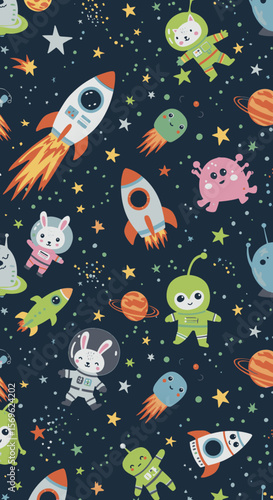 Cute cartoon astronauts, aliens, rockets, and planets float in a starry outer space galaxy, creating a whimsical cosmic adventure.