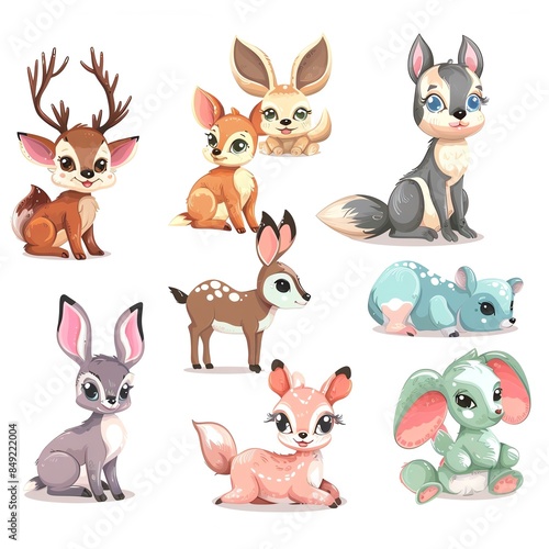 Cute cartoon baby forest animals in various poses, including deer, bunny, fox, raccoon, and elephant, isolated on white.