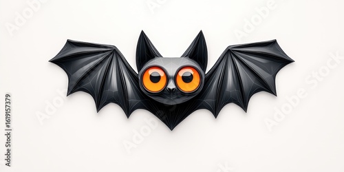Cute cartoon bat vector illustration graphic character. Cartoon animal with large orange eyes and black wings. Halloween fun, adorable mascot, isolated on white background, playful art, modern