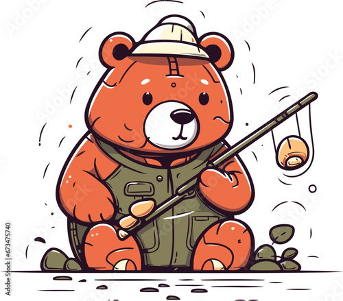 Cute cartoon bear fisherman with fishing rod. Vector illustration on white background.